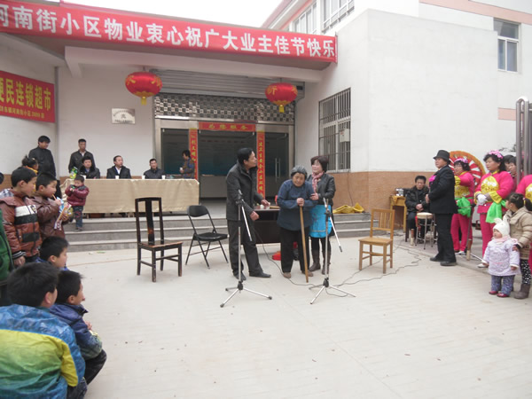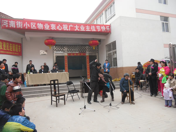 。ㄐ畔T:李建華)農歷正月十三(2月4日),河南街小區(qū)鑼鼓喧天,彩旗招展,熱鬧非凡,呈現出一片祥和的節(jié)日氣氛。 上午10時聯歡會準時開演,小區(qū)業(yè)主自編自演的腰鼓舞、扇子舞、拉開了這次活動的序幕,他們以優(yōu)美、歡暢的舞姿,以矯健穩(wěn)定的舞步,揮舞著手中的彩帶與鼓錘,生龍活虎,時伏時起。精彩的表演,贏得了在場觀眾的陣陣掌聲,尤其是小品《遲到的紅梅》將聯誼會逐漸推向了高潮,詼諧幽默地方話臺詞、真情再現的感情留露,深深的感染著在場的每一位觀眾。同時也讓我們清醒的認識到,尊老愛幼的傳統(tǒng)美德,無論在什么時候,我們都應該繼承與發(fā)揚,理解與關愛自己身邊的長輩與老人。 通過這次聯誼會,不但拉近與改善了物業(yè)與業(yè)主的關系,也活躍了小區(qū)精神文化生活,同時也體現了物業(yè)與小區(qū)業(yè)主都是一家人的魚水之情,鼓舞了物業(yè)辦全體員工繼續(xù)搞好小區(qū)各項工作的信心。