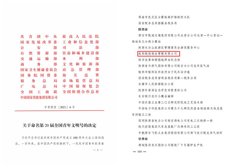 【咸陽城投物業(yè)管理有限公司榮獲“第20屆全國青年文明號”稱號!】